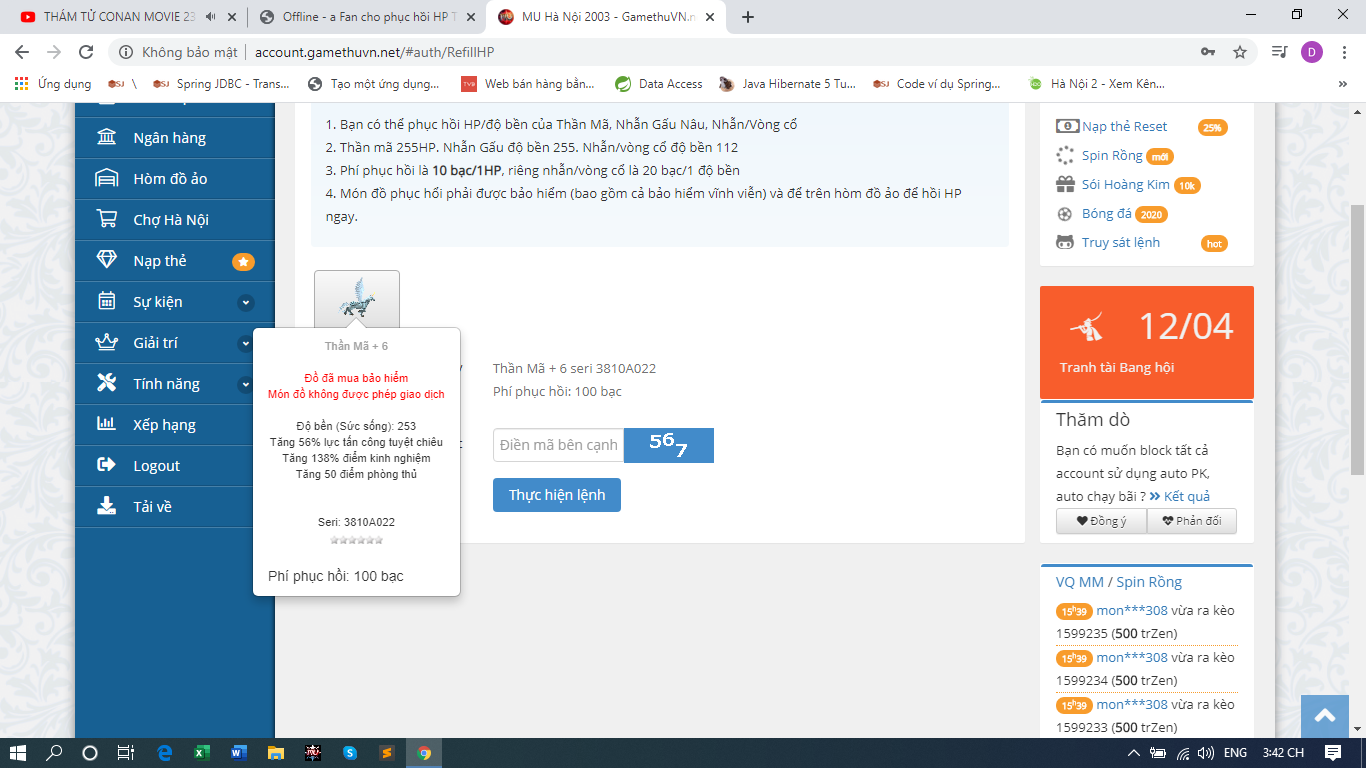 14. con TM 6 253hp của mình định phục hồi nhưng tốn 100 bạc liền thế mà quản lý acc lại ghi 10 bạc/1hp không hiểu ntn???
