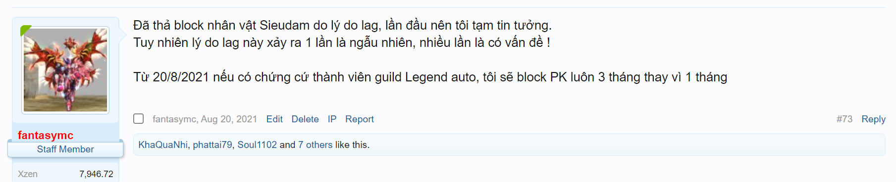 Tôi chủ acc Versace. Trc đó chơi vm từ open. Mới quay lại sv hn chơi. Việc block auto pk. Tôi có biêt do có thông baod trên trang chủ đầy đủ. việc khoá 3 tháng. k có thông bảo trên trang chủ. không có bài cụ thể. chỉ là 1 coment tròn 1 toppic, tôi k hề biết về vấn đề này. Việc áp dụng khoá là hết sưc vô lý. đến luật pháp còn cần phải phổ biến tới từng người dân ms đc thi hành. đây không có thông báo cụ thể. k có bài đăng cụ thể việc áp dụng phạt là hết sức vô lý.
