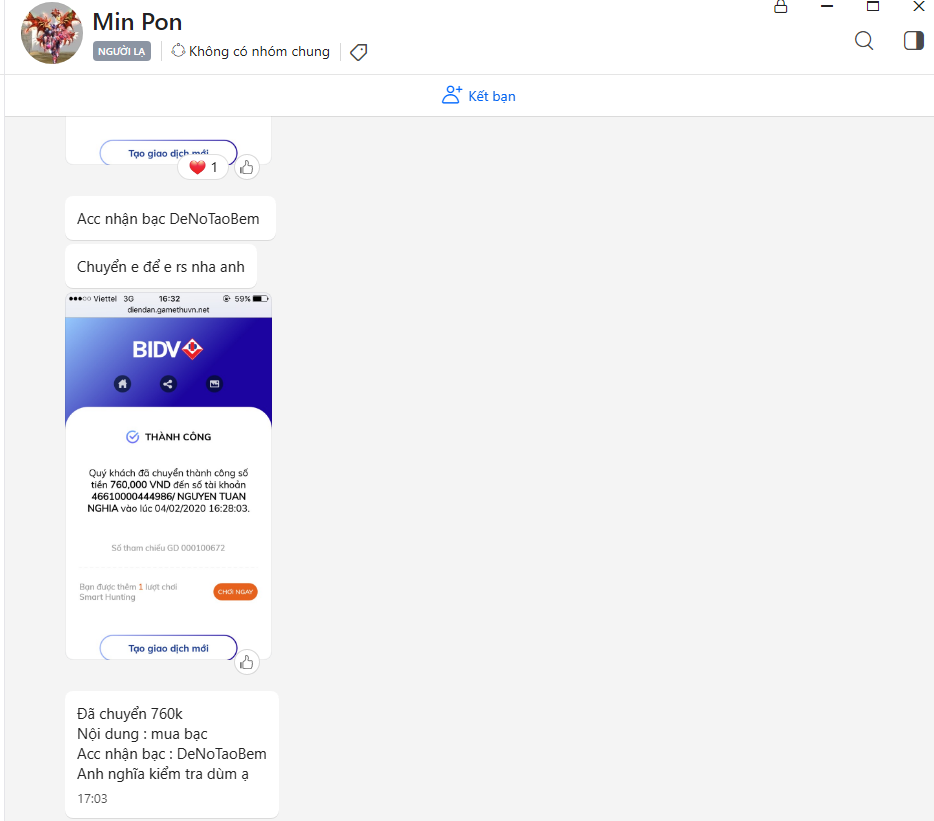3. Theo ý kiến của mình với bạn này .Nếu hấp dở , nổ trong game và trên diễn đàn thì không sao,cho game thêm vui vẻ.Nhưng khi có dấu hiệu của sự lừa đảo,đặc biệt lừa đảo tân thủ thì Fan nên loại bỏ vĩnh viễn dù là giao dịch không qua trung gian.Ở đâu cũng có đạo lý phải không anh em .