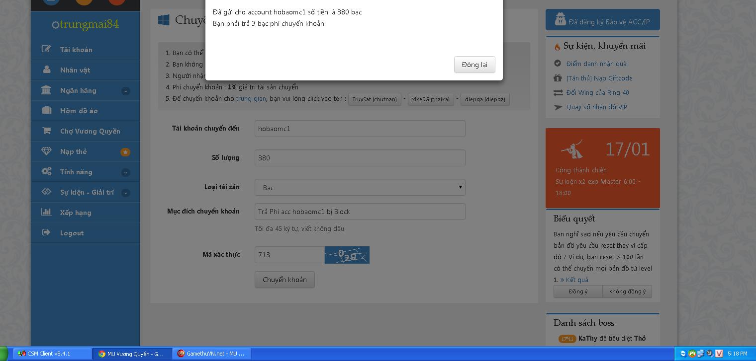 GangterMU said: ↑ Phí bạn mất là: 10% tài sản giao dịch và 100 Bạc Tổng là 380 Bạc. >> Phí để thả accoount, Bạn dùng Account khác chuyển vào Account khóa: hobaomc1, tôi sẽ trừ vài thả account Đồng thời bạn cần mua thẻ nạp chuẩn bị sẵn, sau khi tôi thả account thì bạn phải nhanh chóng nạp cho người ta. Nếu trong vòng 2 giờ sau khi thả ko chuyển bạc, Xác định nghỉ Game tập 2. Giao dịch sẽ bị hủy bỏ, tôi trả bạc cho người bán ! GangterMU said: ↑ Tổng là 380 Bạc. >> Phí để thả accoount, Bạn dùng Account khác chuyển vào Account khóa: hobaomc1, tôi sẽ trừ vài thả account Tóm lại bạn cần 380 bạc và thẻ Viettel 200k. Tôi đã chuyển 380 bạc và tôi đã câẩn bị sẵn thẻ VT 200K Đề nghị GT thả acc để tôi nạp thẻ cho số 01683849384 Bây giờ là 18H17 rồi GT có thể kiểm tra seri 75579403264 xem thẻ mệnh giá bao nhiu và đã sử dụng chưa? để khi tôi nạp thẻ ko có vấn đề gì sảy ra Mở mấy acc của tôi và em tôi để tôi còn cày. Thanks
