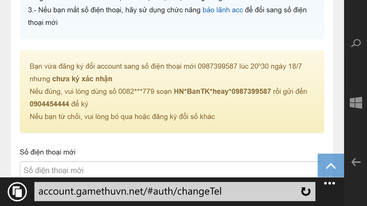 Tất cả các account đang trong thời gian bảo lãnh, bảo lãnh vĩnh viễn, chống đổi số điện thoại... không được phép đổi số (kể cả SMS đúng số đăng ký và đúng cú pháp).