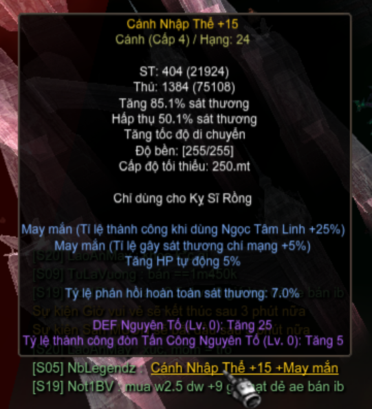 1 .Để ép dòng nguyên tố cho Wing 4 và Wing Master, bạn đến gặp tiên nữ Adniel ở Elbeland (38x216) Nguyên liệu cần thiết: Wing 4 + linh thạch + Golden Crest x9 + Higher Magic Stone x3 _ Linh thạch yêu cầu hạng 1 level 4 trở lên, tỉ lệ thành công 15%. Level cao sẽ đạt tỉ lệ cao . Lv5 - 25%, lv6 - 40%, lv7 - 50%, lv8 - 60%, lv9 - 75%, lv10 - 90% _ Golden Crest có thể kiếm được nhờ săn boss, hoặc đổi bằng điểm tri ân từ admin _ Bạn có thể dùng thêm bùa may mắn (loại dùng cho sách và thuộc tính): tăng thêm 10% tỉ lệ thành công _ Nếu thành công, bạn sẽ được thêm 1 dòng phòng thủ nguyên tố. _ Nếu bạn được tổ tiên phù hộ, sẽ được thêm dòng nguyên tố thứ 2 2. Để nâng cấp dòng nguyên tố, bạn cần đá nguyên thuỷ RUNE và 1 mZen _ Lv0-3: tỉ lệ 50% _ Lv3-4-5-6: tỉ lệ 45% _ Lv7-8-9: tỉ lệ 40% _ lv10-11-12: tỉ lệ 35% _ lv13-14: tỉ lệ 30% _ Thành công sẽ tăng lên 1 level, thất bại giảm 1 level 3. Lưu ý cụm HN2003 và HN2 (VQ+BV): Hiện tại wing Master chưa hỗ trợ nâng cấp dòng nguyên tố trong game. Vì vậy bạn có thể nâng cấp dòng nguyên tố cho wing 4 bất kỳ, sau đó liên hệ admin để chuyển dời kết quả sang wing Master. Vấn đề này sẽ xử lý trong bản nâng cấp sắp tới. https://gamethuvn.net/help/?mode=vi...3cIPG7DKa9aQiio1PzNH6OzpZyDpGTBRZB1-4DJTD4_0G